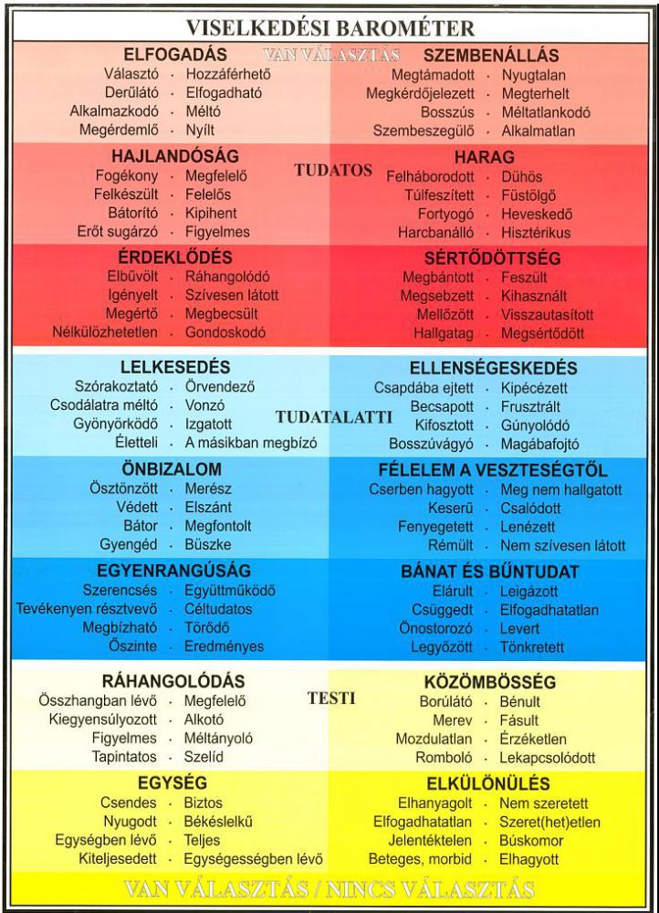 Ezután egy Viselkedési Barométeren megkeressük azt a negatív érzelmi energiát, ami fogva tart bennünket, majd ennek pozitív párját is. Nem ellentétpárokról van szó, hanem egymást semlegesítő energiákról, melyek egyensúlyi állapotot hoznak vissza.